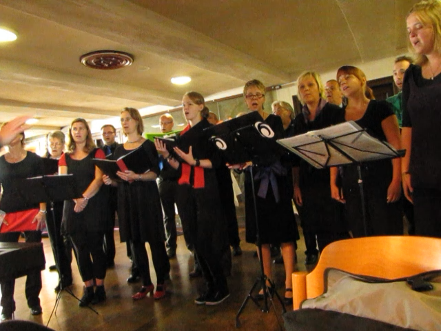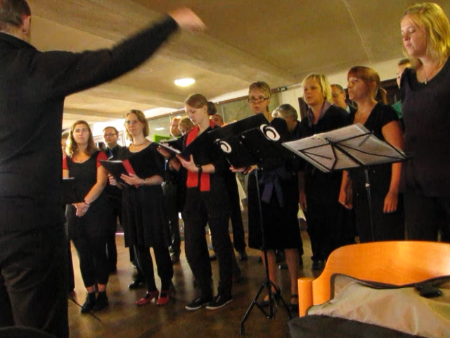 Rot für Sopran, Violett für Alt, Blau für Tenor und Grün für Bass waren in großen Stoffbahnen hinter dem Chor aufgehängt und fanden sich als Gürtel, Hüftschal oder Krawatte bei den Sängern wieder. Auch sorgte Friedrich Krüger mit Texten zur Musik für Hintergrundwissen.