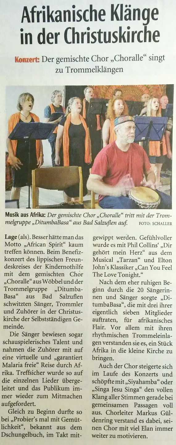 „So entführten der Song ‚Seid zur Freundschaft bereit‘ aus Walt Disneys ‚Dschungelbuch‘ sowie fetzige Hits wie Emilia Torrinis ‚Jungle Drum‘ oder ‚Afrika‘ von Ingrid Peters die Zuhörer in die exotisch-geheimnisvolle Welt des zentralafrikanischen Dschungels. In die Savannenlandschaft der ostafrikanischen Serengeti versetzten Evergreens wie ‚The lion sleeps tonight‘ und ‚Africa‘ von Toto, aber auch stimmungsvolle Melodien wie ‚Can you feel the love tonight?‘ und ‚Dir gehört mein Herz‘ aus den Muiscals ‚König der Löwen‘ und ‚Tarzan‘, die der Chor ebenso einprägsam wie gefühlvoll vorzutragen verstand. Letzte Station der musikalischen Afrikareise war Südafrika – der sehr beschwingt dargebrachte Song ‚Waka,Waka‘ und mehrere in originaler Zulusprache gesungene Spirituals dürften manchen Gast an die Fußball WM 2010 im Land am Kap der Guten Hoffnung erinnert haben. Zwei Gospels trugen die ‚Choralle-Singers‘ zusammen mit dem Kinderchor der Grundschule Schieder vor, der sich anschließend mit einem bunten Strauß fröhlicher afrikanischer Kinderlieder in die Herzen der Zuschauer sang. Wirkungsvoll unterstützt wurden die Wöbbeler Sänger ferner durch die Djembe – Percussion-Gruppe ‚Kadha Kidole‘ aus Schlangen, deren virtuose Trommelklänge zwischen den Gesangsdarbietungen entscheidend dazu beitrugen, dass der Funke des ‚African Spirit‘ auf die Zuschauer übersprang. Den abschließenden Höhepunkt eines sehr gelungenen Konzerts bildete die von Erwachsenen-und Kinderstimmen gemeinsam intonierte Hymne ‚We are the World‘ von Michael Jackson, die mit starkem Beifall bedacht wurde.“ (Friedrich Krüger)