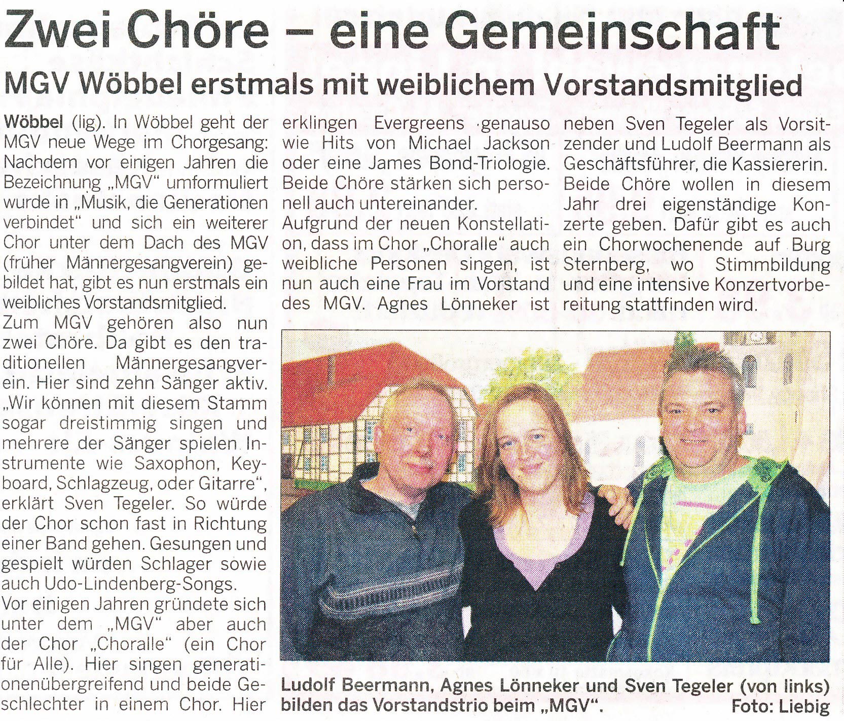 „Erstmals eine Frau im Vorstand beim MGV Wöbbel“ LZ-Bericht vom 28.03.2013