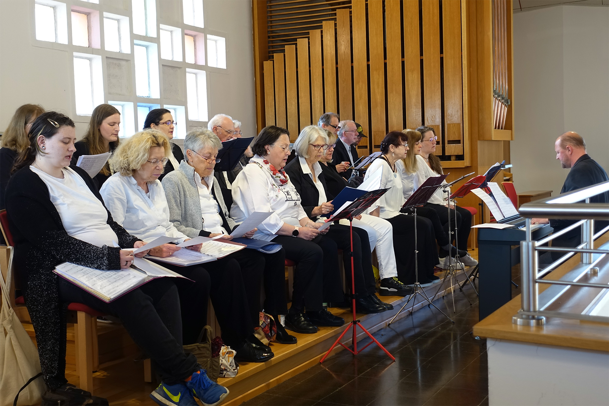 In einem sehr dynamischen Stil mit vollem Körpereinsatz, höchster Konzentration und Motivation, weiß er seine Sänger rhythmisch zu führen und wieder auf den richtigen Weg zu bringen, insofern ihnen die Melodie und Töne entgleiten. Entweder begleitet er uns auf dem E-Piano oder wir singen zu instrumentalem Playback. Außerdem unterstützt uns Maestro Musicus Markus auch mit seiner frabenprächtigen Stimme. Bei anstehenden Auftritten singt er selbst im Tenor oder Bass mit, wenn es zum Männermangel kommt, wie bei den Konfirmationen 2024 und 2025 geschehen (s.o.). 🙂